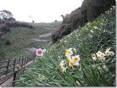 水仙一杯の斜面の中、遊歩道を歩いていく
