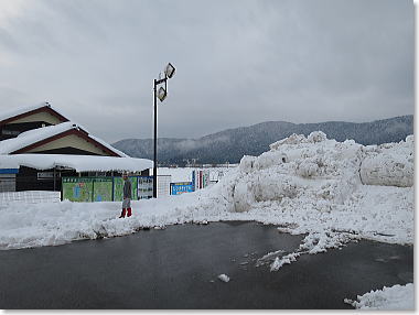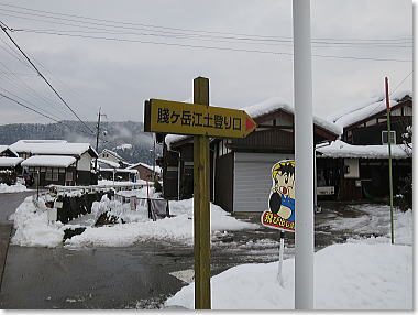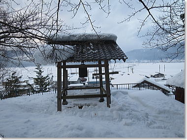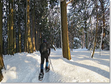 例年にない、駅での大雪に驚き! 鐘つき堂でスノーシューに履き替え、いざ出発。
