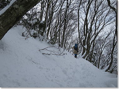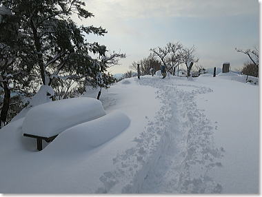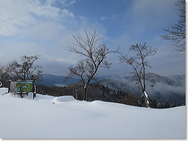 山頂では、久しぶりの「無風」。きらきら光る琵琶湖や、余呉湖を見おろし360°の“新雪の大”を楽しんだ。昼食休憩ののち、もと来た道を戻った。(1昨年までは、国民宿舎“余呉湖荘”の風呂に入ってのんびりしたのだが、閉館してしまったので)