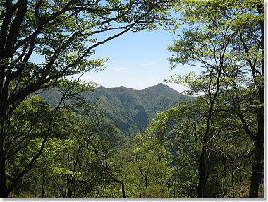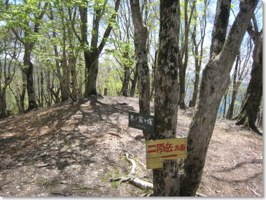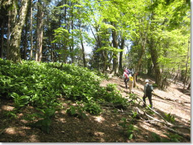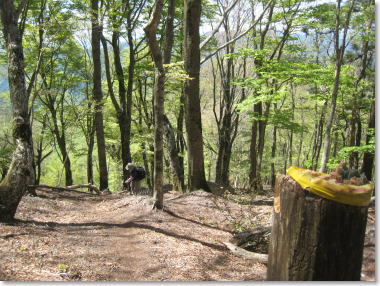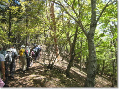 | 尾根道は、新緑の世界。 左に、カエデの大木! (二階岳から木ノ実矢塚へ向かう) 10:10 |