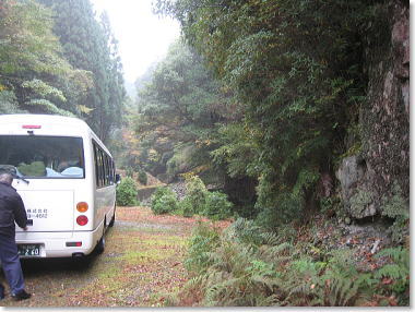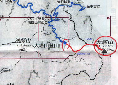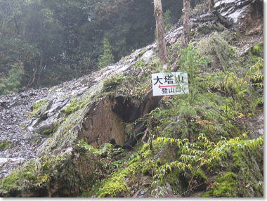 林道のその先、未舗装の道を行き、橋を渡った突き当りが、登山口。 まぁ、この奥深い山も植林が進んでいるのには感激。 登山口は標高460m位なので、山頂までその差約660m位なのだが最初から急登が連続し、脚がすすまない。やっと、905mポイント(法師山との縦走蕗・分岐点)をトラバースした付近、広い尾根で昼食休憩。