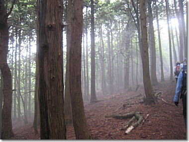 桧林を進んでいくと、霧が立ち込め、