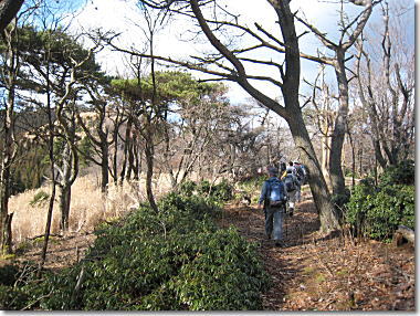 ササ原の中、緑の馬酔木(あせび)が道縁に・・