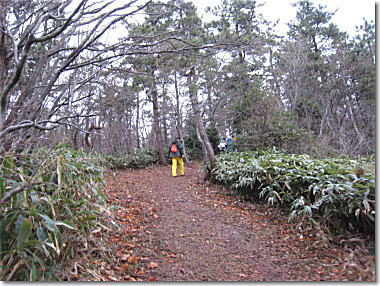 に到着までは雨が降り続いていましたが、歩き出したら雨はやみ、結局下山するまで降らず!この天気にしては、視界もよく、日本海の海岸線もくっきりと見回すことが出来ました。 |