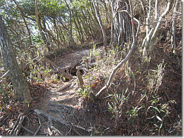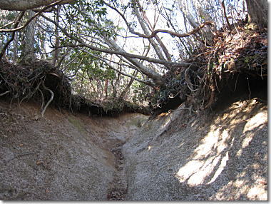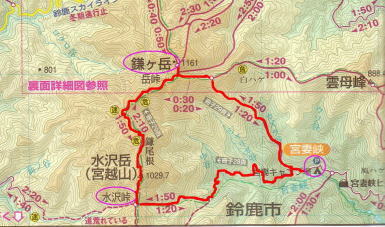 | 東名阪道・鈴鹿ICから宮妻峡へ。水沢(すいざわ)の茶畑から、ギザギザの鎌尾根を持つ鎌ガ岳を遠望する。御在所岳と並ぶ姿は、一方は大きく、一方は鋭く、大変魅力的な山容である。登山口から、すぐに沢を渡る。 カズラ谷コースは、谷の名前がついているが、尾根道である。 沢を2つ越え、登りにとりかかる。杉・広葉樹林の尾根道を登っていく。 やがて、花崗岩やガレが現れる。 ブナが多くなってくると、雲母峰への分岐に。 左に、鎌ガ岳山頂へ向かう。