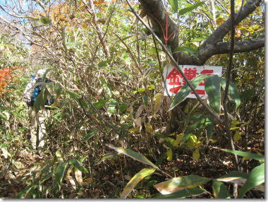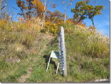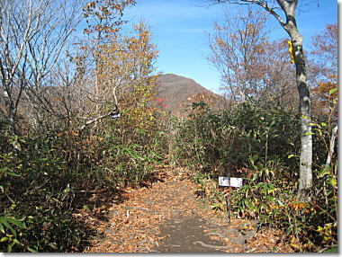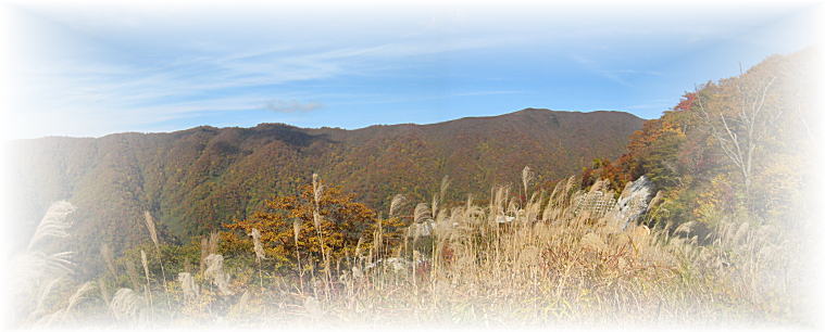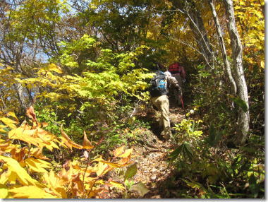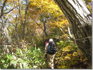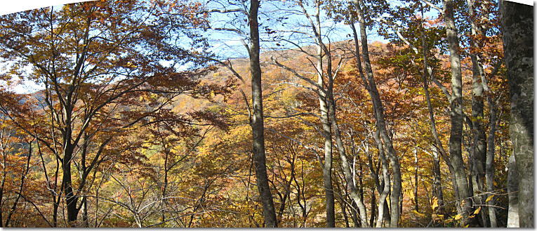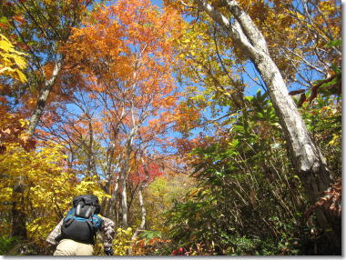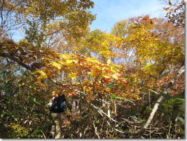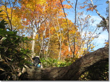| 金糞岳:秋色のブナ林から金糞岳・山頂を、すかし見る 13:53 |
