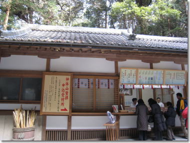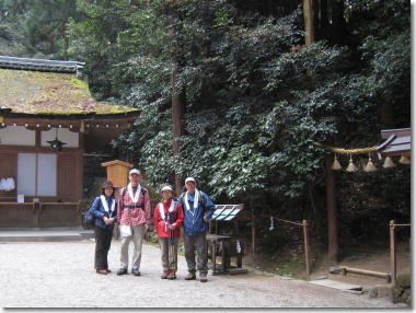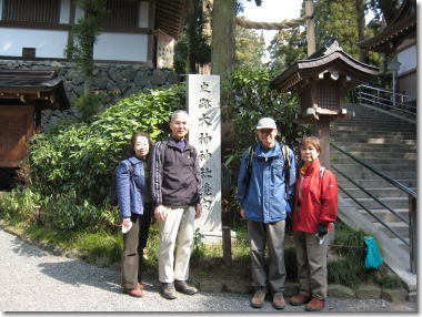 | いつもは、山頂までの様子を撮るのですが、今回は、なにしろ撮影禁止のご神体山に登るのですから、証拠として、記念撮影。 《薬の神》として有名な、狭井(さい)神社で、300円を収め、登拝届を書き、登拝証と書かれたタスキを戴き、首にかけて、出発します。尾根道から、大小の岩を祀る場所を過ぎ、大神(おおみわ)神社奥の院が山頂。そこから約100mで奥津磐座と呼ばれる大岩があります。ここは、大物主命が鎮まるとされ、神が降臨する神聖な所とされる古代祭事遺跡だそうです。タスキの鈴が、“ちりんちりん”と鳴って風情のある登拝でした。 |