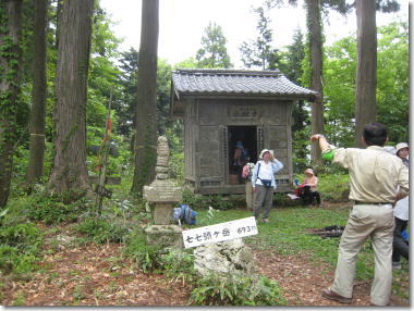 急坂を登りつめると、山頂。 山頂には、西林寺という観音寺、七七頭神社がある。毎年4月と11月に、成子参りの習俗があり、その時には、寺社の関係者も登山して祭典が営まれるという。