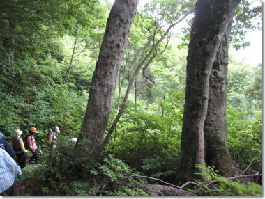 ブナは、もともと寒い所を好む植物。葉から雨を集め幹を伝って、根元へ水分を集めます。天然のダムと言われています。この山地のように、アカガシとブナが同居しているのは珍しいそうです。