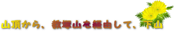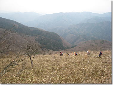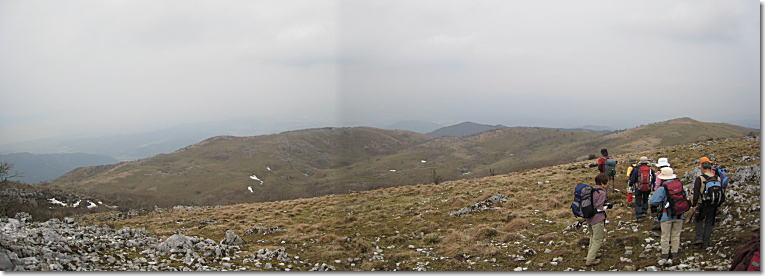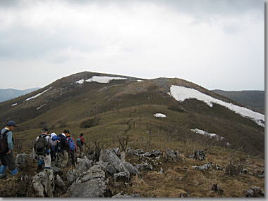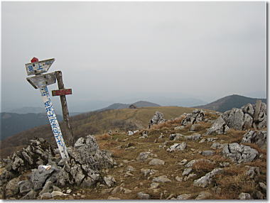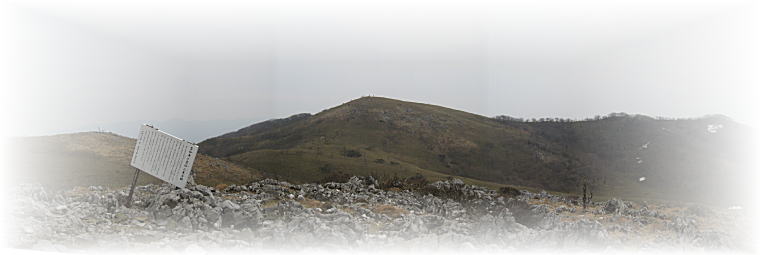 山頂から、教塚山を経由して、下山です。山頂から、教塚山を眺める風景は、カレンフェルト(複雑な形をした石灰岩)が点在するカルスト地形が、最も良くあらわれています。広大な高原台地です。お虎ケ池・お猿岩・汗拭峠から下山。