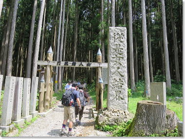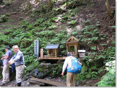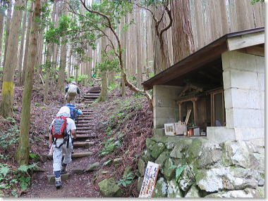 清浄大橋たもとの駐車場に車をとめ、清浄大橋を渡り、女人結界門をくぐる。 いまだに女人禁制なのだ。 きれいに手入れされた杉林の中を通り、山すその道を登っていく。 途中で、“ブォ〜、ブォ〜”のほら貝の修験姿の人とすれ違う。《よう お参り!》。 お助け水で小休憩。 洞辻茶屋へ。