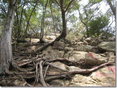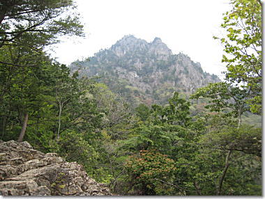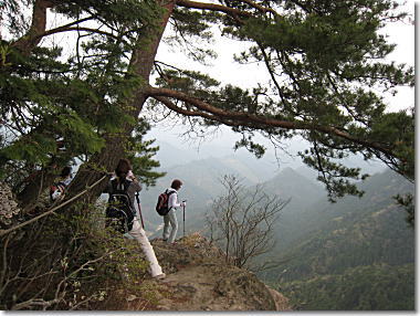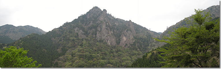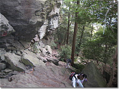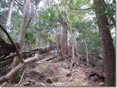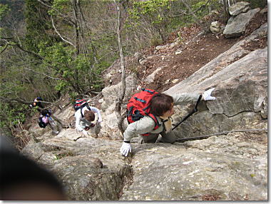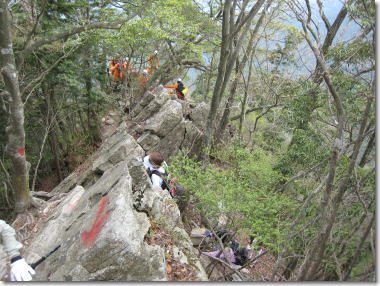 登山口から登り始めたと思ったら、いきなり急坂。だんだん岩が多くなり、登ったところが展望岩。大天井岳・地蔵岳などの岩峰が迫力ありましたね。尾根道を歩き、また急登して出雲岩へ。高さ30m、ひさしが4mも張り出していましたね。その裏側の鎖を登って、覗き岩で播州方面を望み、馬ノ背・・岩登り・・そして、大天井岳に、やっと到着。姫路市消防局の人々の訓練と重なり、緊張感が伝わってきましたね。 |