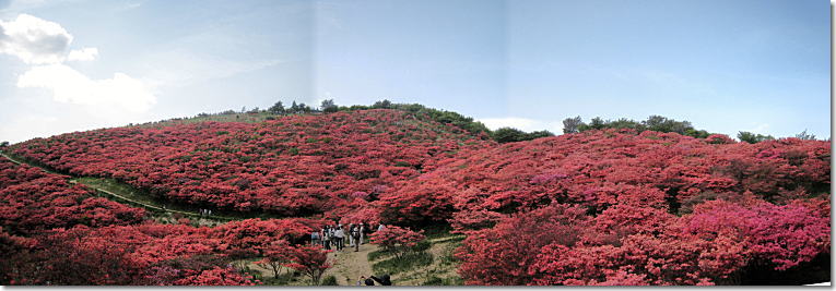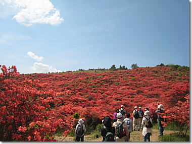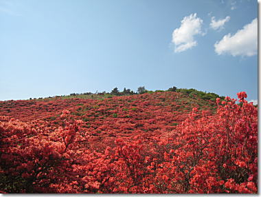 下部展望台に到着。 下から見上げる景色は、上から眺めるとのはまた違って、迫力ある、一面のヤマツツジ景色を見せてくれました。空に雲が流れ、光に陰と輝きが出ると、また微妙に陰影がつくのです。