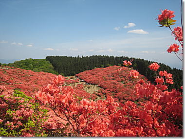 | 新緑の広葉樹林を登りきると、目の前に、真っ赤のヤマツツジが! あの感動は、登ったことのある多くの人々なら、ご存知でしょう。 金剛山を背景に、上の展望台から眺めました! |