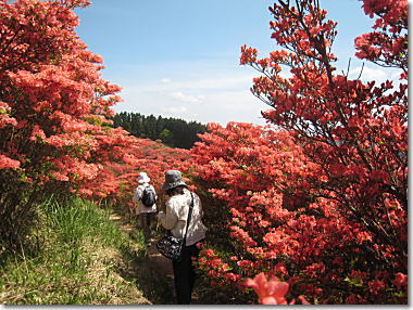 | 今回は、どうしても、下の展望台から、上を見上げたくて真っ赤に染まる、ヤマツツジの中を、降りていきました。木の下に紛れ込むと、迷子になりそう。 |