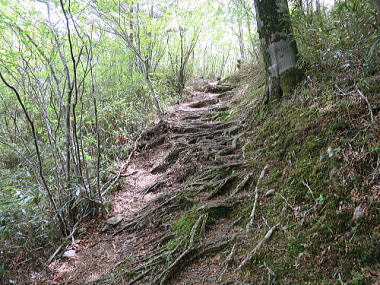 新緑の中、中央構造線(海底が盛り上がり)贈り物の岩石を踏みしめて登っていく。 9:19