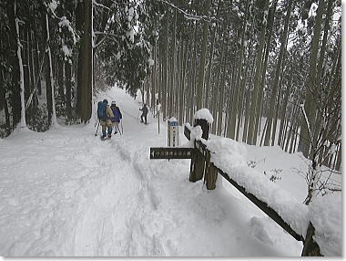 例年にない、駅での大雪に驚き! 鐘つき堂でスノーシューに履き替え、いざ出発。