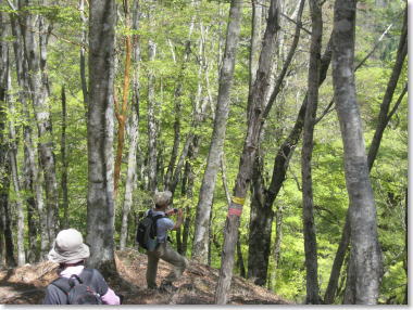 ブナ・カエデの樹林。急坂を登る 10:35 |