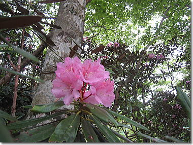 これからは、もと来た道をたどって下山。鞍部付近には、オオヤマレンゲの蕾らしきものを発見。今月末ごろからは咲き出すのだろう。あの苦しかった木段を下り、カエデ新緑の中・・・シロヤシオの白い花の下・・・奥駈道を歩く。 急尾根のシャクナゲ・ピンクの花を愛でながら登山口へ。