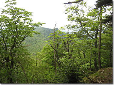 大峯奥駈道(おおみね・おくがけ)分岐からは、穏やかな起伏の稜線歩きだ。分岐付近は、シロヤシオの白い花が、沿道を飾る。 そこを過ぎると・・・オオイタヤメイゲツをはじめとした、《カエデ》の世界! 新緑が美しい!きっと秋には紅葉の芸術を演出してくれることだろう。これが、奥駈道(おくがけ)だぁ。 なぜか楽しい気分になり進んでいくと、弁天ノ森(1600m)。そこから、一旦下り、徐々に登っていくと、聖宝ノ宿跡(しょうぼうのしゅくあと)。大峰中興の祖と言われる聖宝理源大師の等身大の坐像が出迎え。