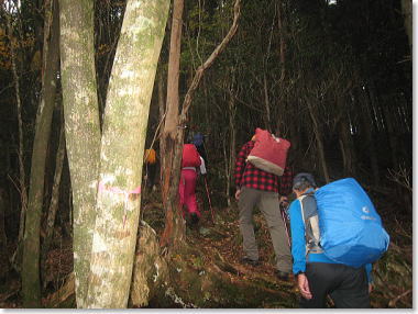 林道のその先、未舗装の道を行き、橋を渡った突き当りが、登山口。 まぁ、この奥深い山も植林が進んでいるのには感激。 登山口は標高460m位なので、山頂までその差約660m位なのだが最初から急登が連続し、脚がすすまない。やっと、905mポイント(法師山との縦走蕗・分岐点)をトラバースした付近、広い尾根で昼食休憩。