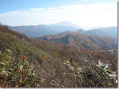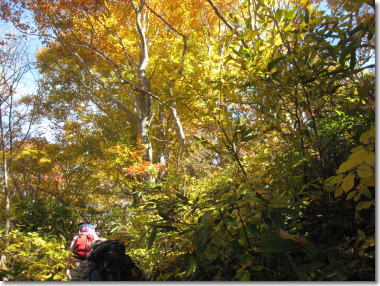 | 金糞岳:秋色のブナ林から金糞岳・山頂を、すかし見る 13:53 |