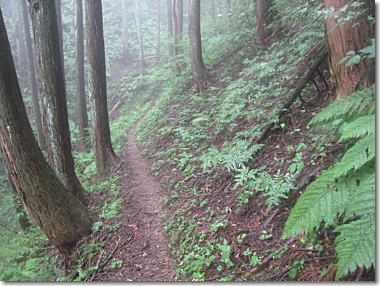 於成神社で小休止、谷を離れ、トチノキの古木の付近・大岩を巻くように登っていくと、稜線へ。 稜線の急坂をあえぎながら登っていると、目の前を真っ黒い獣が、ざざぁと駆け下りていった。猪か熊か? 『改心の道』と書かれた分岐をなおも登ると、山頂・金峰神社(きんぷ)である。