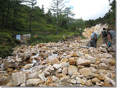 高天原(たかまがはら)は、名前のように、奥深い別天地。静寂。 高天原山荘は、“ランプの山小屋”で、古いたたずまい。 歩いて約15分、温泉沢の沢沿いに、露天風呂!